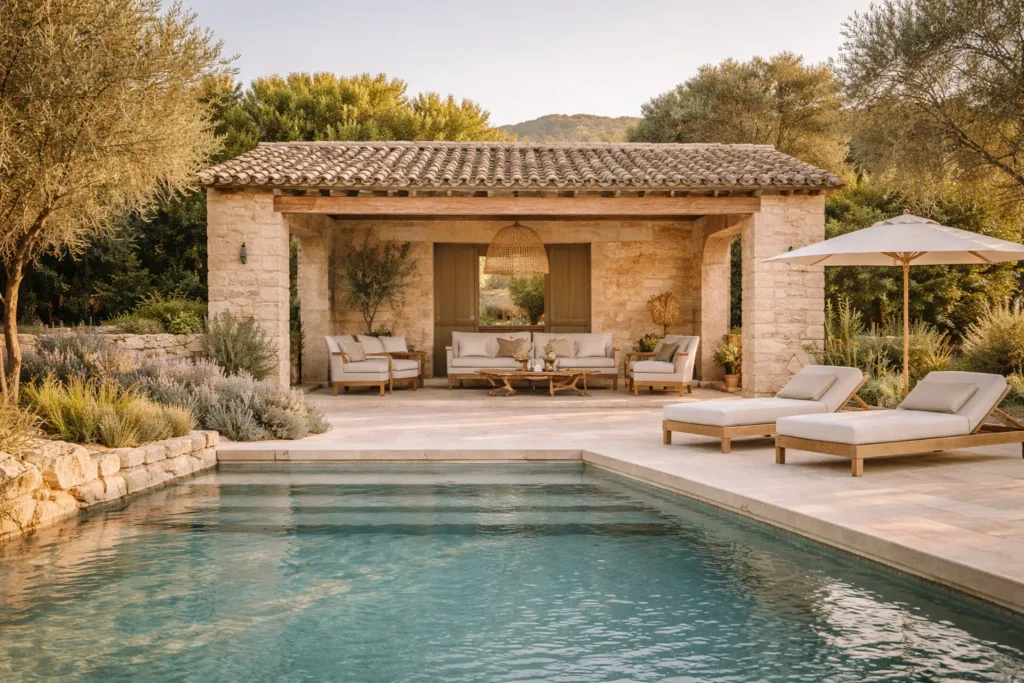Situé au cœur des Alpilles, ce projet de pool house s’inscrit dans un environnement naturel typique du sud de la France, entre pierre, végétation et lumière méditerranéenne. Les propriétaires souhaitaient créer un espace extérieur élégant et chaleureux, en harmonie avec le paysage et l’architecture environnante.