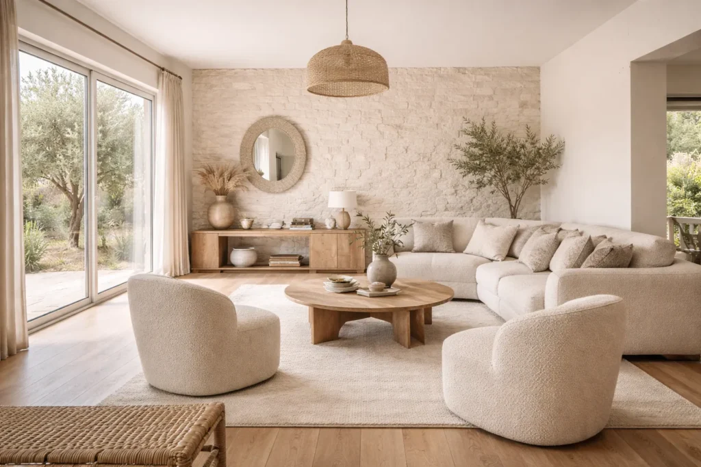 Dans cette maison située à Sanary-sur-Mer, les propriétaires souhaitaient apporter du caractère à leur intérieur tout en conservant une ambiance moderne et épurée. L’objectif était de créer un mur décoratif fort, capable de structurer l’espace sans alourdir la pièce.
